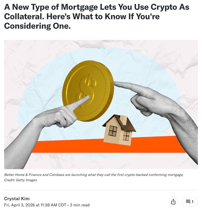 By the way, Fannie Mae recently backed a new crypto-backed mortgage product from Better Home & Finance and Coinbase where home mortgage borrowers can pledge Bitcoin (or USDC) as collateral to help fund a down payment on a home — without selling it.