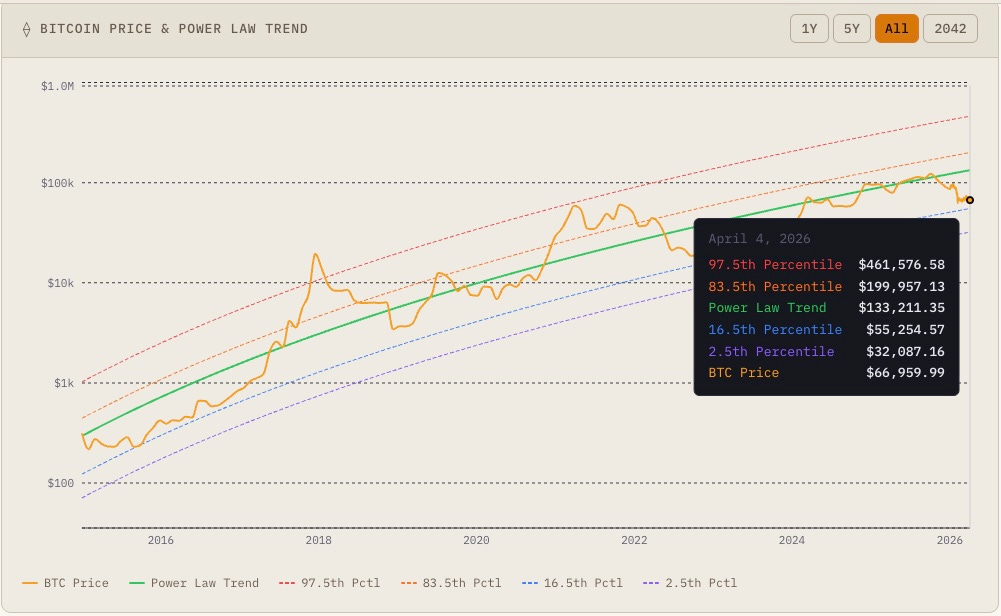 The third treemap projects a world where Bitcoin approaches gold equivalence. Michael Saylor of Strategy has predicted this happening by 2035, with $1.4 million Bitcoin. Analyst Cathie Wood has spoke in similar ways. And the Power Law Trend price for Bitcoin in 2035 is also $1.4 million.